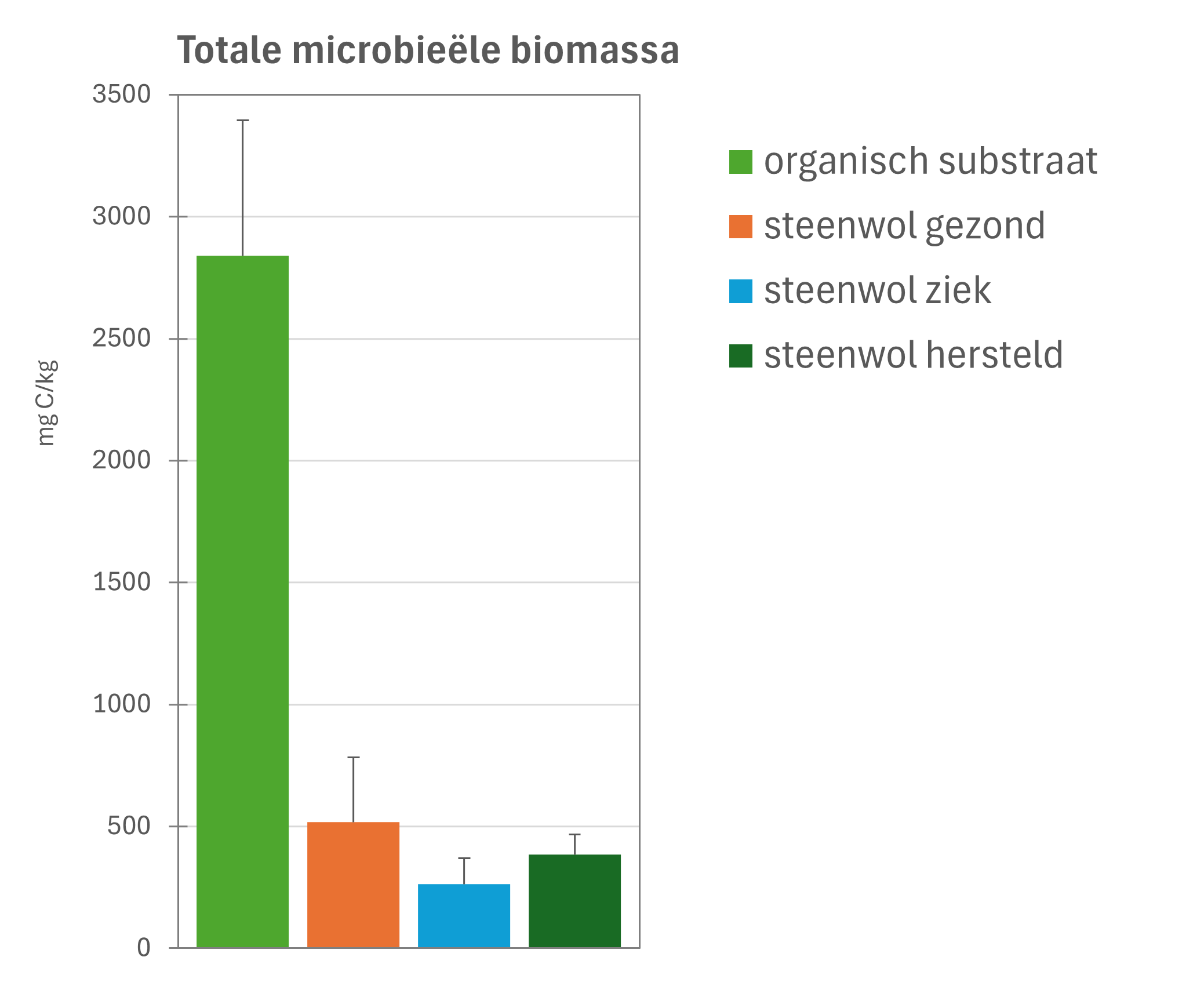 De resultaten zijn veelzeggend. Met BodemlevenMonitor (zie figuur 1) werd in organische substraten aanzienlijk meer microbiologische biomassa aangetroffen dan in steenwol. Gezonde matten bevatten vaak meer biomassa dan zieke, maar duidelijk minder dan de organische varianten. In het organische materiaal was de schimmel-bacterieverhouding gunstiger, en de diversiteit aan micro-organismen was hoger in het organische materiaal.